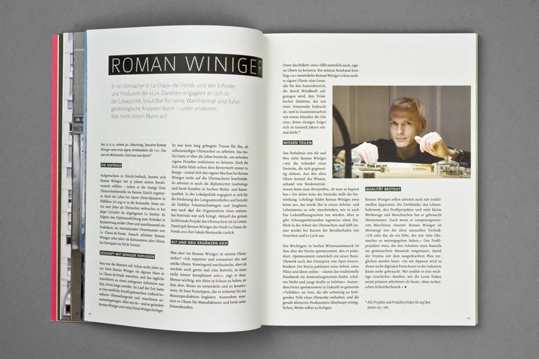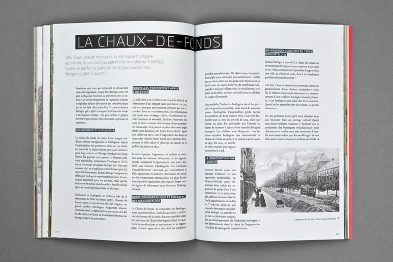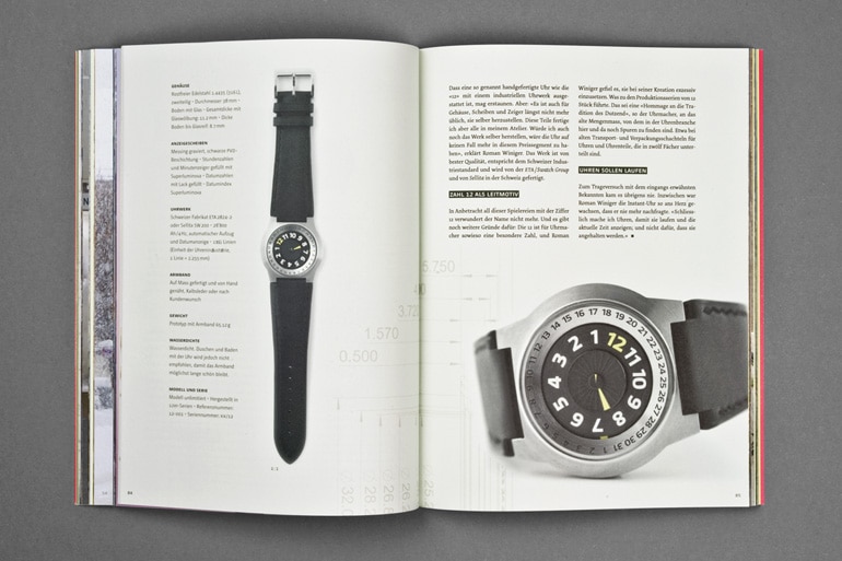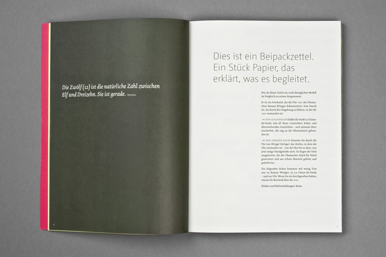 Les pages comportent tout de même un peu de texte, qui vous parleront de Roman Winiger, de la ville – et bien sûr de la montre. Après les avoir parcouru, vous saurez tout sur la « 12 ».