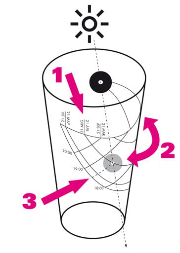 - Tourner le verre vide, jusqu’à ce que l’ombre croise la ligne de la date actuelle.